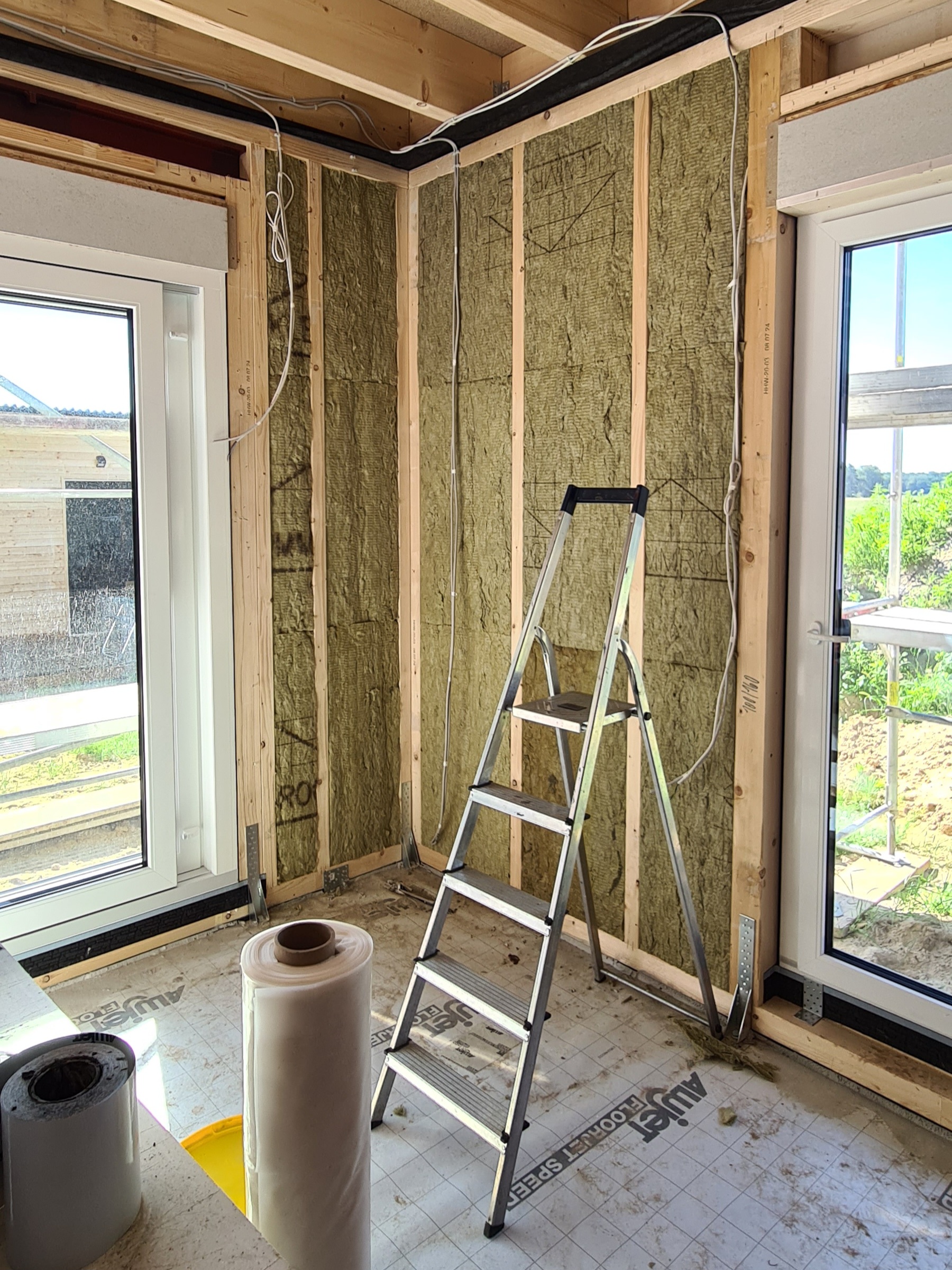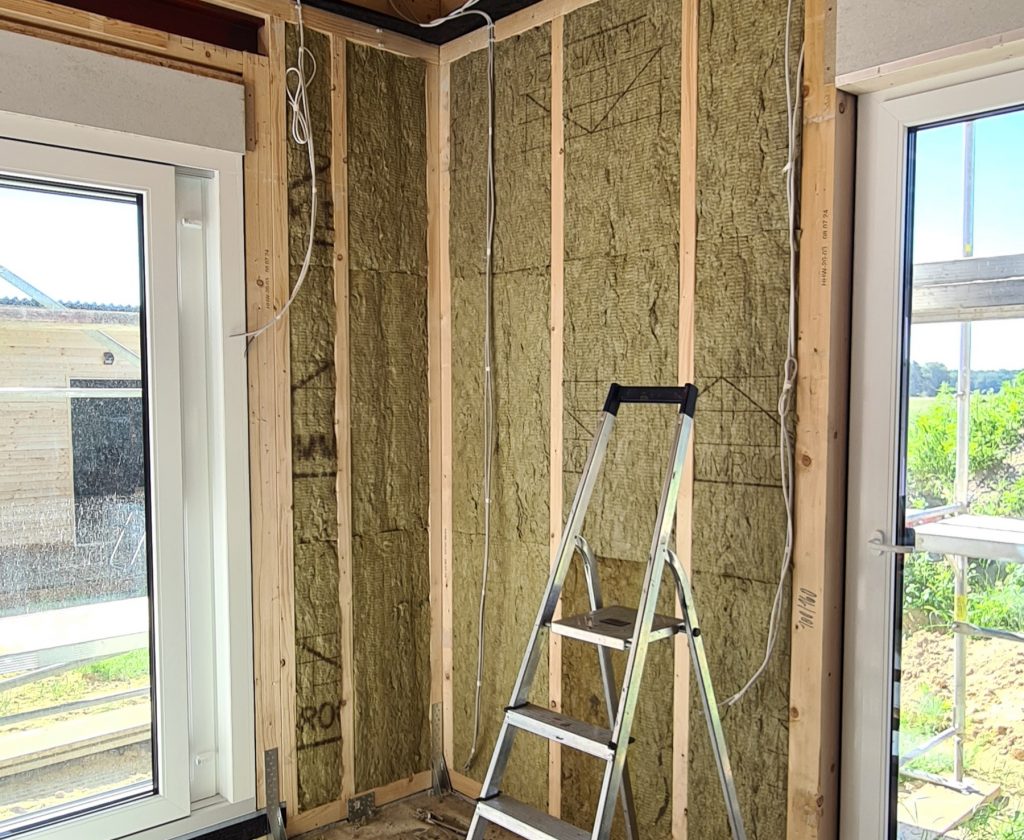 Am gestrigen Abend hatten wir dann alle äußeren Wände mit Steinwolle fertig gedämmt – erstes kleines Etappen-Ziel erreicht.