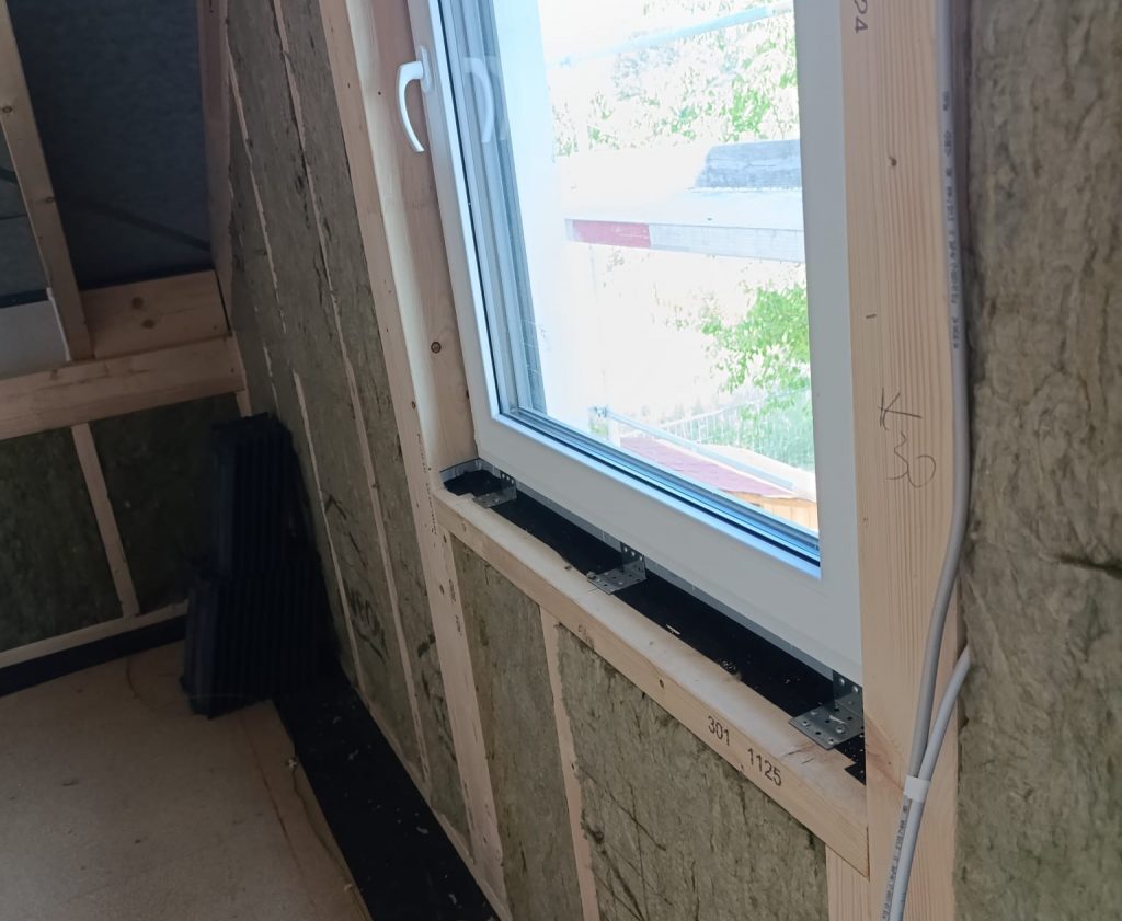 Bis zum Abend schaffen wir es heute, zumindest im ersten Stock, eine Hilfslattung anzubringen, die wir benötigen, um danach die Dachlatten daran zu befestigen, an die wiederum die später folgende Wandverkleidung geschraubt wird. Ich schneide die Latten an der Kappsäge auf die richtige Länge, während Daniel sie dann im Obergeschoss an die richtigen Stellen schraubt.