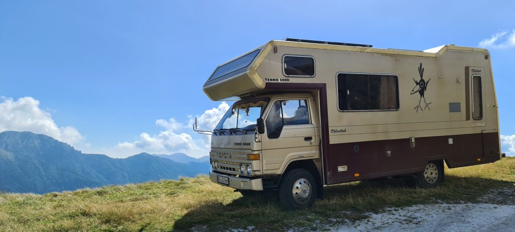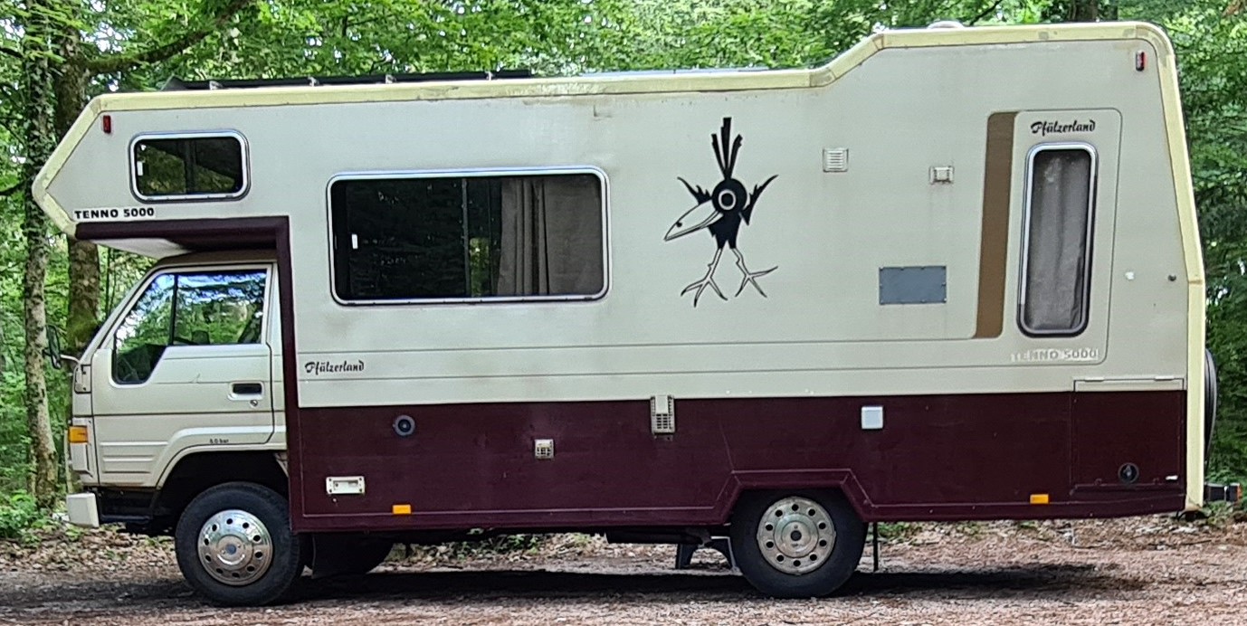 Holger, der Vorbesitzer, der vor neun Jahren dafür sorgte, dass der Tenno sein Oldtimer-Kennzeichen erhält, erzählte mir, dass das Wohnmobil 1986 von einem Toyota-Händler in Auftrag gegeben worden sei, um bei einem Jubiläum des Händlers, im Zuge einer Tombola, verlost zu werden. Weil das Wohnmobil damals nur zu diesem Zweck von der Firma Ormocar gebaut wurde, handelt es sich um ein Einzelstück.