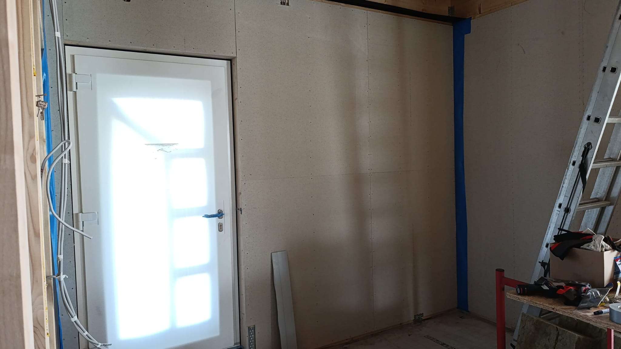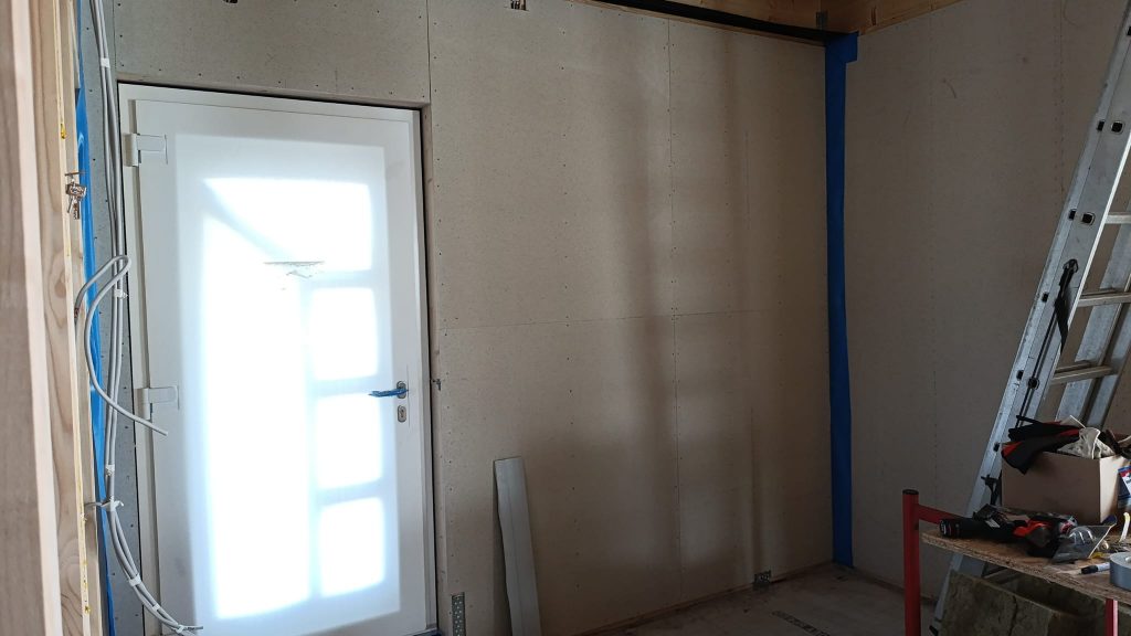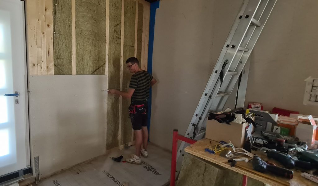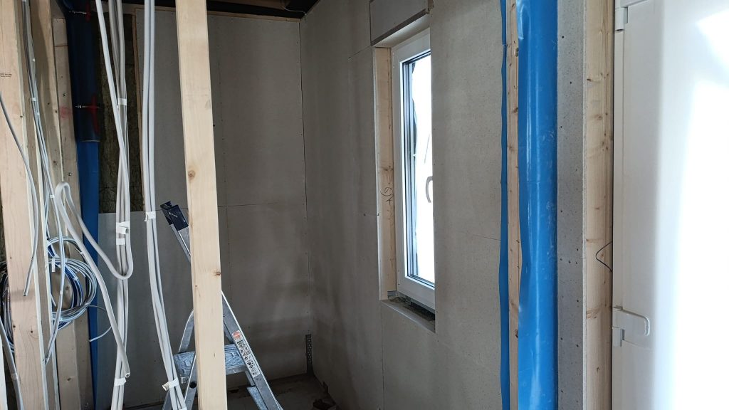 Daniel und ich hatten begonnen, die ersten Wände mit Fermacell-Platten zu verkleiden. Dazu mussten wir die Platten mit einer kleinen Handkreissäge auf das richtige Maß schneiden und überall, wo Kabel bzw. Metallwinkel verlaufen, kleinere oder größere Ausschnitte aussägen. Dann setzten wir die jeweils fertig zugeschnittene Platte an ihren Platz, um sie mit Schrauben am Holz-Ständerwerk zu befestigen. In etwa alle 15 cm eine Schraube.